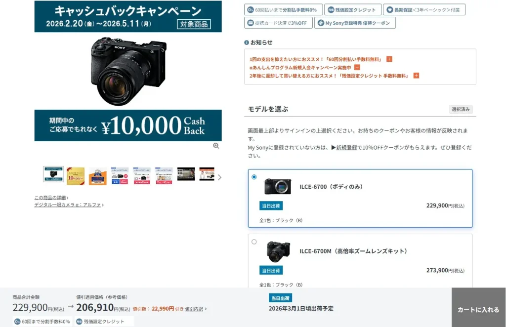 キャンペーンは通年開催ではなく、春、夏、秋、冬といった季節ごとの商戦期に合わせて実施される傾向があります。例えば、「スプリングキャッシュバックキャンペーン」などでは、α6700のボディ単体やレンズキットが10,000円の還元対象になることが多いです。